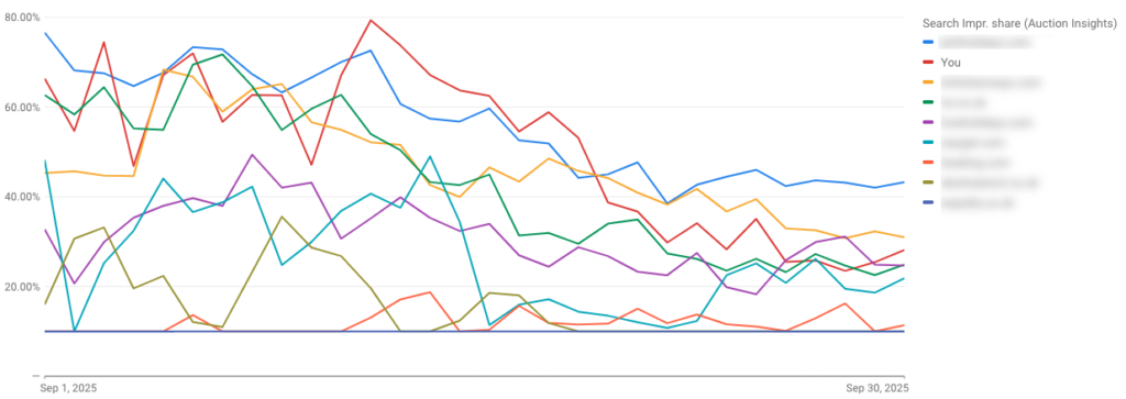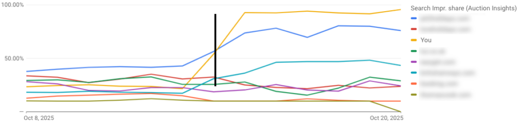 Impression share tanked on a certain day, and remained low. On the same day, the ‘auctions insights impression share’ of all competitors plummeted along with it (we’re the red line).