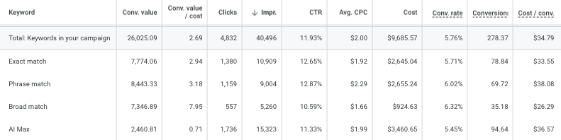N.B. The search term match type segmentation is an excellent way to assess AI Max’s incremental value, and here’s what it shows about performance in that first account: