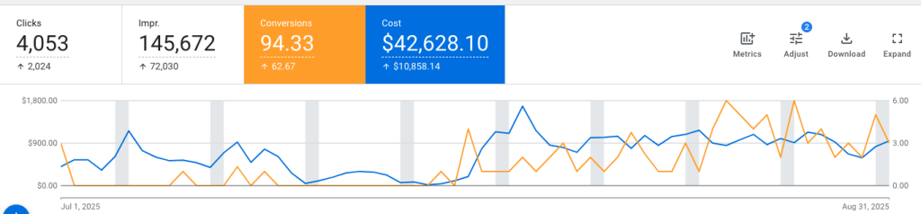 This account serves a high-end private medical service – specialist, niche, and high-ticket (often no-go territory for Google’s more expansive targeting options). No need to mark it on the chart, you can see the clear uptick at the point when AI Max was introduced – with cost jumping significantly, but conversions jumping by even more…