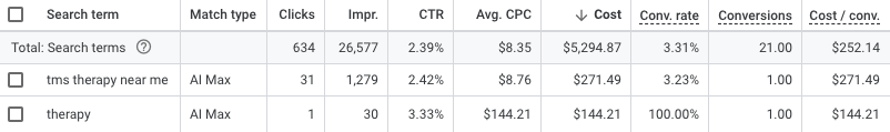 But importantly, that crazy bid was placed on a pretty rubbish-looking search term. In theory, “therapy” is much too generic a term for the high-ticket, highly-specialised treatment being advertised in this account.
